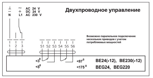- Переведення заслонки клапана в положення "відкрито" або "закрито" проводиться за допомогою зовнішнього керуючого сигналу, що передає «фазу» напруги живлення з одного контакту приводу на інший.