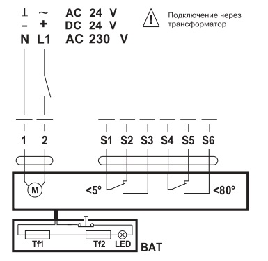 Привод обладнаний двома фіксованими перемикачами для сигналізації кінцевих положень. Проміжне положення приводу вказує на механічний індикатор (стрілка). - Ручне керування.