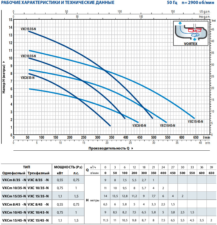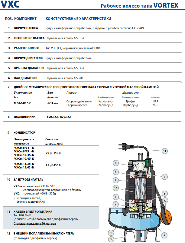 Насоси Pedrollo серії VXC виготовлені з товстостінного чавуну, що характеризується високою міцністю та стійкістю до абразивної дії, та оснащені робочим колесом типу VORTEX. Рекомендуються для дренажу води, що містить важливі тверді частинки, каналізаційних стоків, атмосферних стічних вод, суміші води з брудом.
