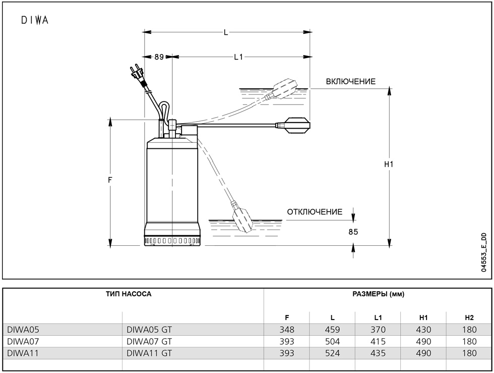 - встановлений вимикач поплавця для автоматичної роботи насоса