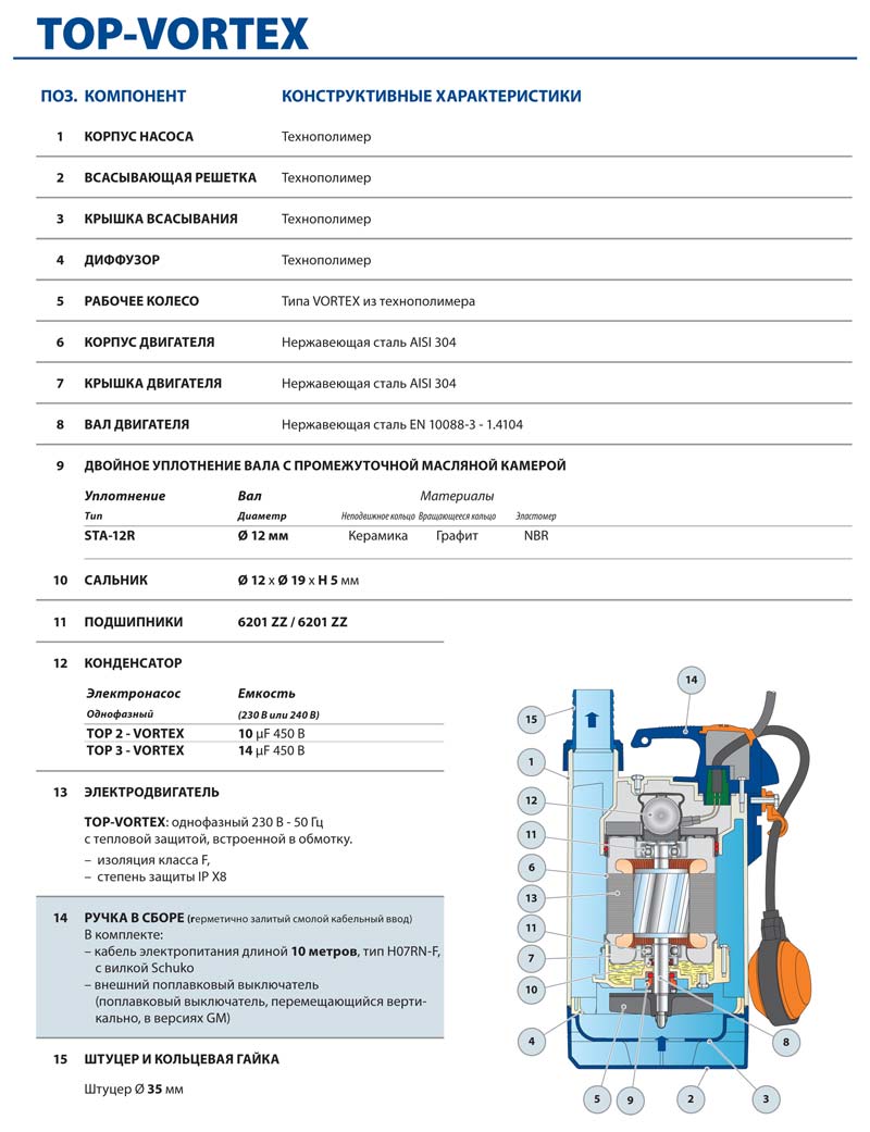 Насоси TOP-VORTEX підходять для дренажу забрудненої води, хімічно неагресивної по відношенню до конструкційних матеріалів насоса. Застосовані конструктивні рішення забезпечують простоту в експлуатації та безпеку функціонування насоса завдяки повному охолодженню двигуна та подвійному механічному ущільненню валу.