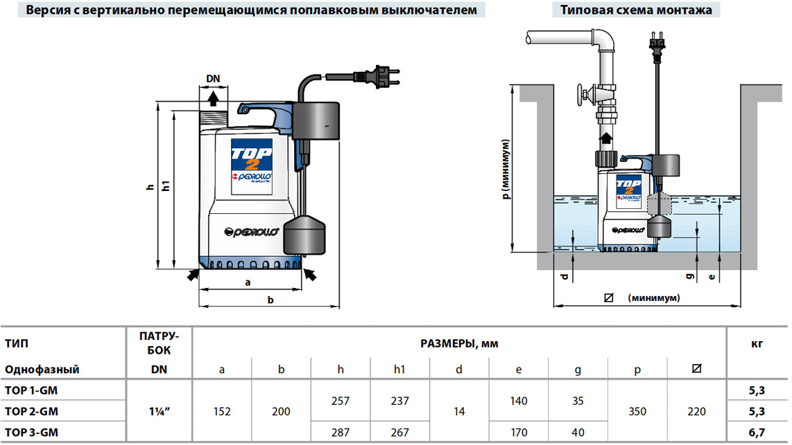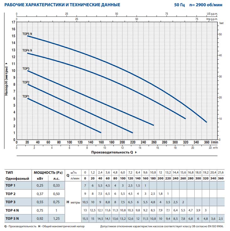 - Глибина застосування нижче за рівень води: до 3 м для TOP 1-2-3; до 5м для TOP 4-5.