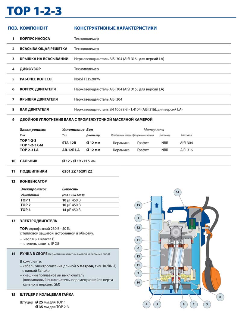 Занурювальні дренажні насоси Pedrollo TOP рекомендуються для підйому чистої води без наявності абразивних частинок. Використані конструктивні рішення забезпечують простоту в експлуатації та безпеку функціонування завдяки повному охолодженню двигуна та подвійному механічному ущільненню валу.