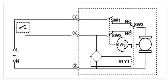 При отриманні запиту на тепло контакт SPST реле замикається на RLY1, живлення подається і в результаті контакти NO перемикача SW3 відкривають клапан. Коли клапан повністю відкритий, кулачок закриває перемикач SW1 і відкриває SW2. Після того, як запит на тепло виконаний контакти контролера розмикаються, RLY1 більше не подається живлення і електромотор клапана включається через SW1 і контакти NC перемикача SW3. Коли клапан повністю закритий, кулачок закриває SW2 і відкриває SW1, і клапан знову готовий до запиту на тепло. У разі відмови живлення в клапанах цих двох типів, клапан залишається в положенні на момент відключення електрики. Після відновлення живлення клапан реагуватиме на команди контролера.