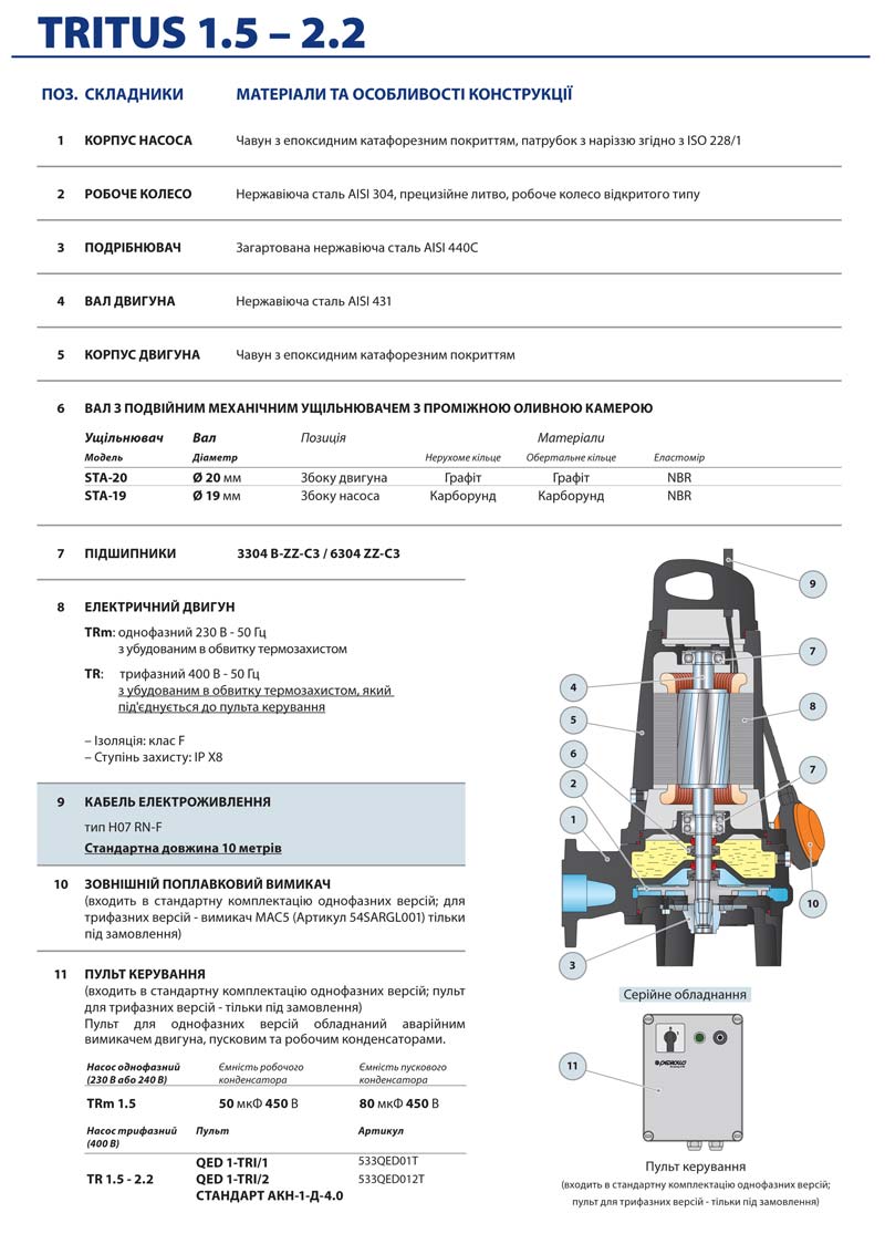 Каналізаційний насос Pedrollo TRITUS спроектований у найкращих традиціях Made in Italy: електронасос має інноваційні проектні характеристики, типові для занурювальних електронасосів Pedrollo, такі як: