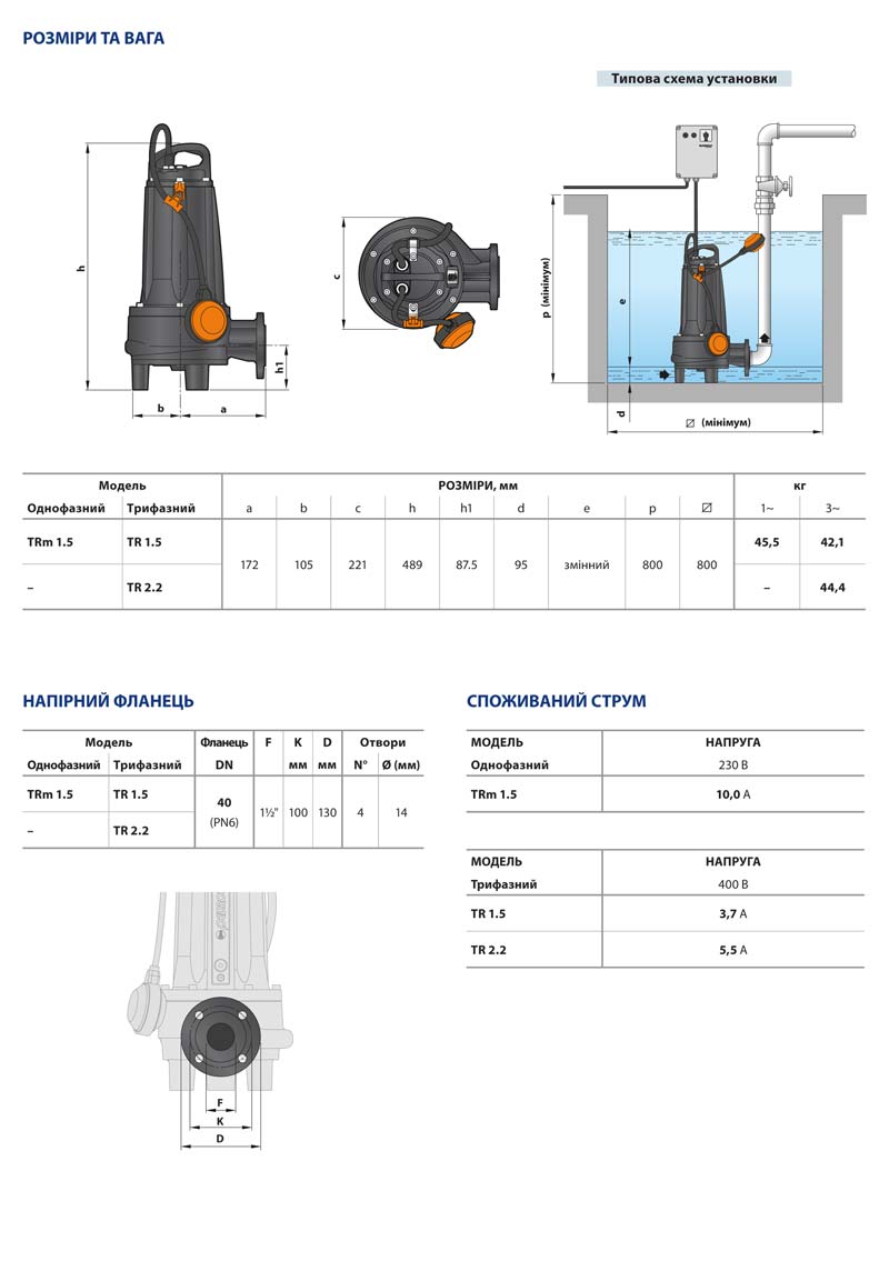 - Мінімальна глибина занурення: 300 мм для TR 0.75-0.9-1.1-1.3 або 350 мм для TR 1.5-2.2