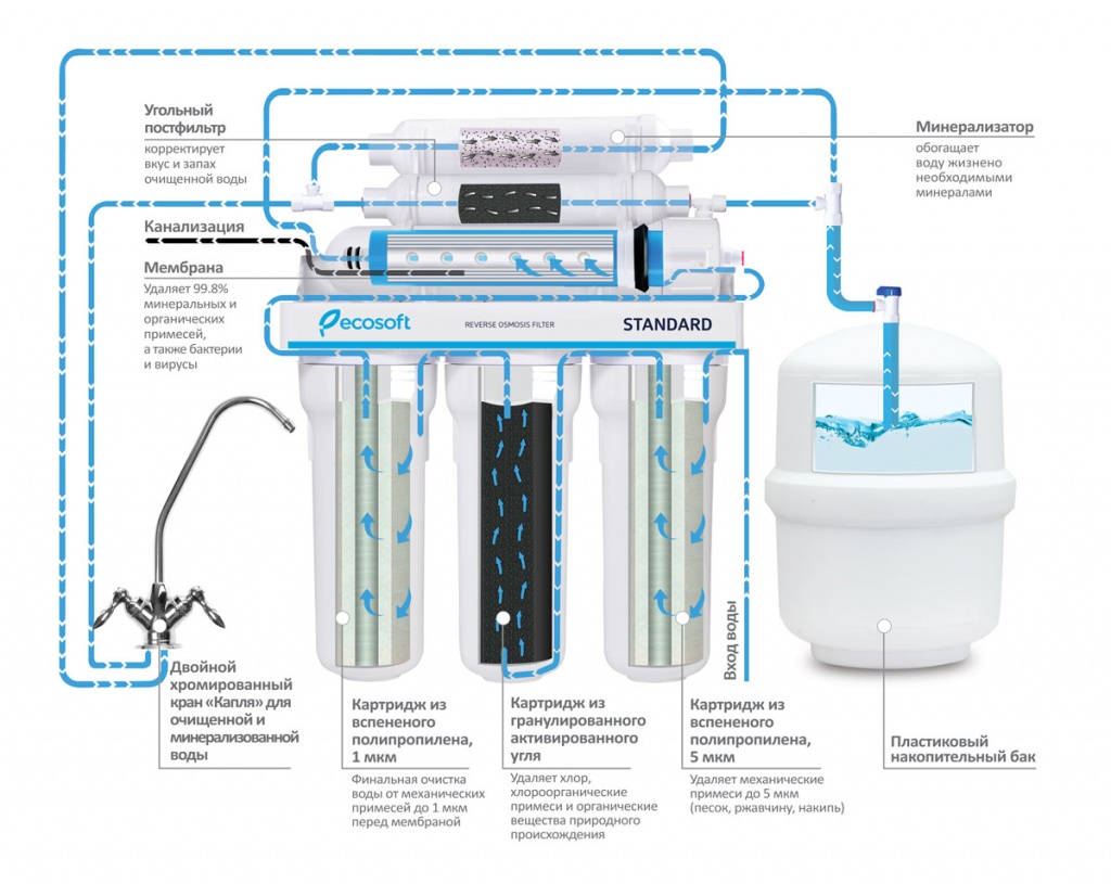 Для відновлення мінерального складу води у фільтрі Ecosoft Standard є спеціальний картридж-мінералізатор.