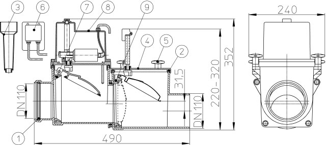 Магістральний 2-х камерний каналізаційний затвор з електроприводом, з можливістю фіксації другої заслінки в закритому положенні, з 2-ма монтажними люками, з входом для підключення зовнішнього сигнального пристрою (сигналізації, контролера...), розтрубним входом та гладким виходом під труби ПП , ПВХ.