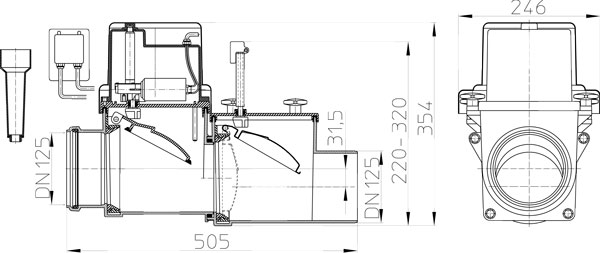 Магістральний 2-х камерний каналізаційний затвор з електроприводом, з можливістю фіксації другої заслінки в закритому положенні, з 2-ма монтажними люками, з входом для підключення зовнішнього сигнального пристрою (сигналізації, контролера...), розтрубним входом та гладким виходом під труби ПП , ПВХ.