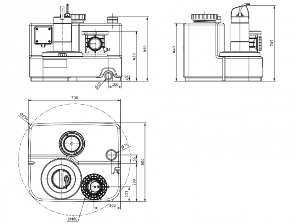 - Клас захисту установки водовідведення: IP68 (2 м вод. ст., 7 днів)