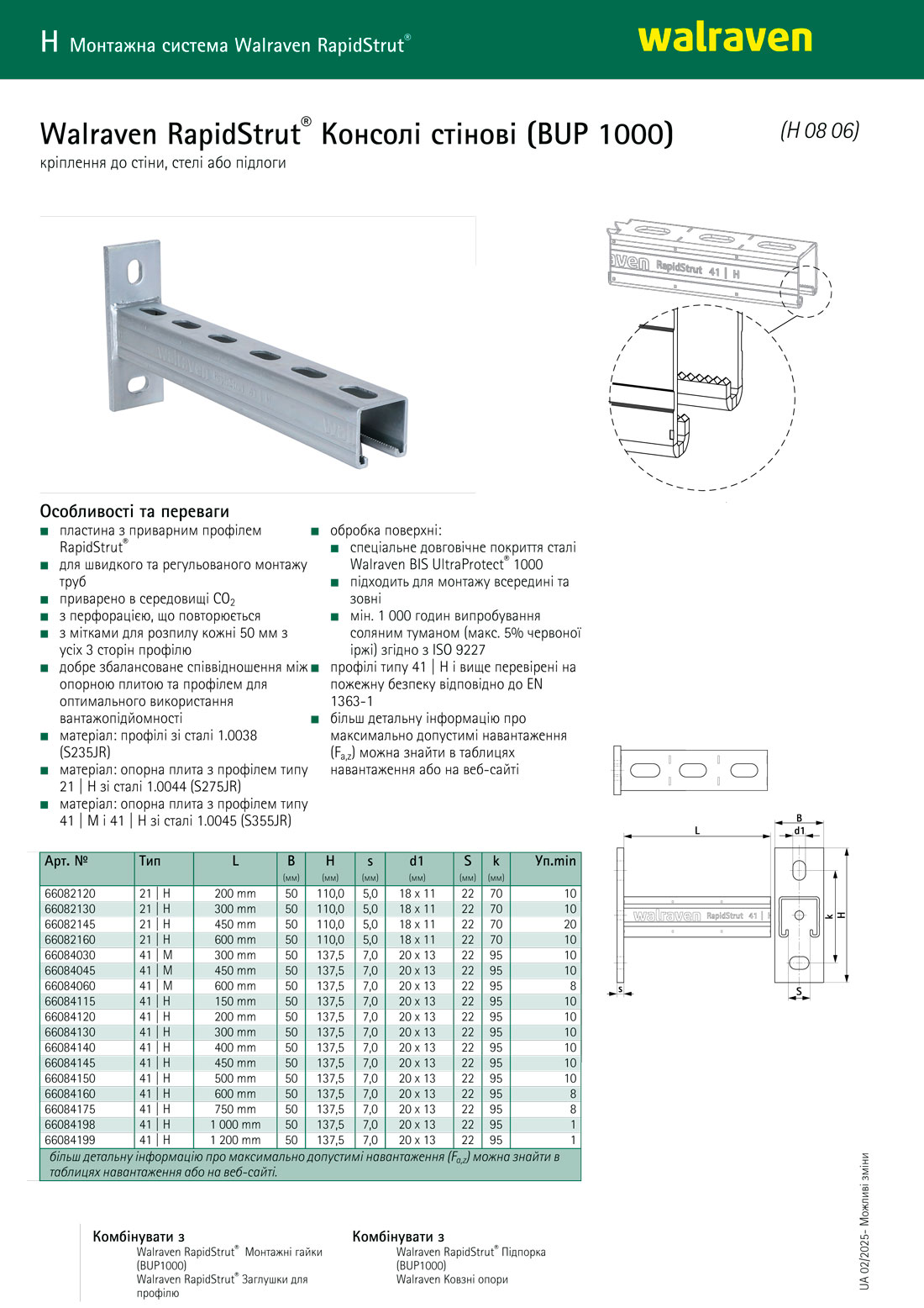 Консоль стінова Walraven BIS RapidStrut® тип 21H | 41x21х2,5мм | 200мм | BUP1000 (66082120)