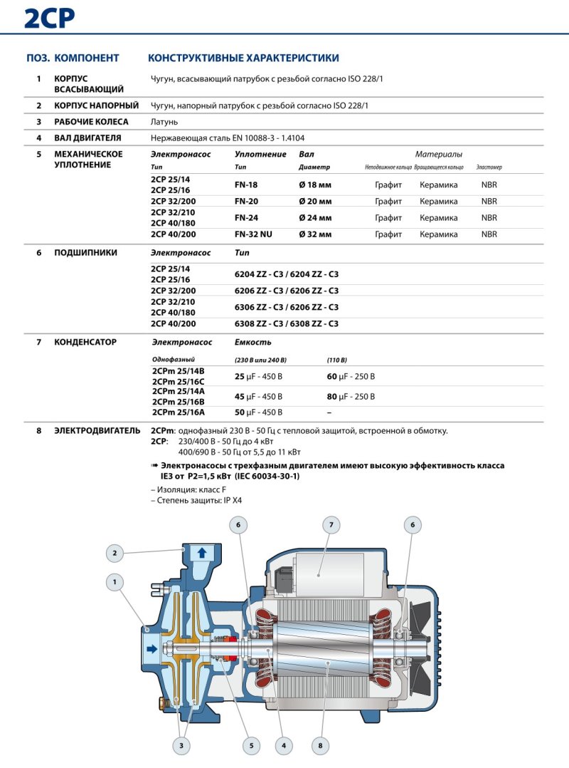 - Всмоктуючий та напірний корпус насоса з чавуну, забезпечений патрубками з різьбленням згідно з ISO 228/1.