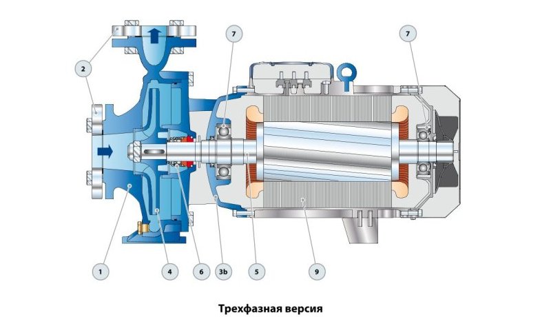 - Корпус насоса з чавуну, оснащений фланцевими всмоктувальними та нагнітальними патрубками.