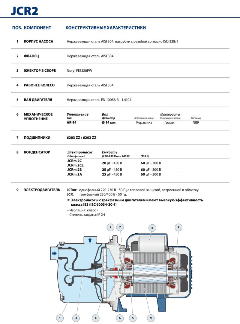- Електродвигун: насоси безпосередньо з'єднані з електродвигуном PEDROLLO відповідної потужності; двигун асинхронний, високопродуктивний, безшумний, закритого типу із зовнішньою вентиляцією, придатний для безперервної роботи.
