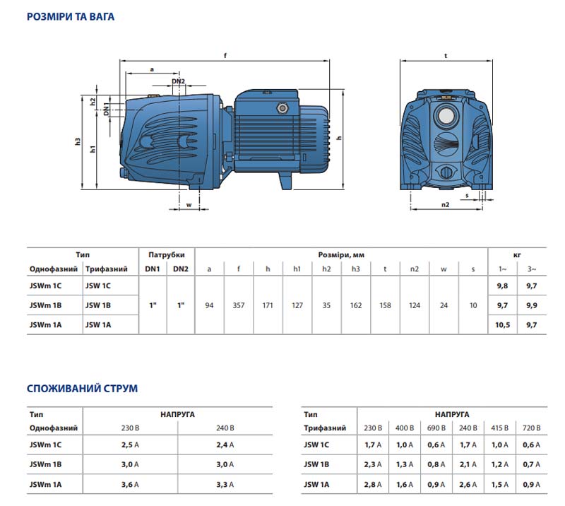 - Корпус насоса з чавуну, забезпечений всмоктувальними та нагнітальними патрубками з трубним різьбленням gas UNI ISO 228-1, а також бічними отворами з різьбленням для кріплення манометра та реле тиску.