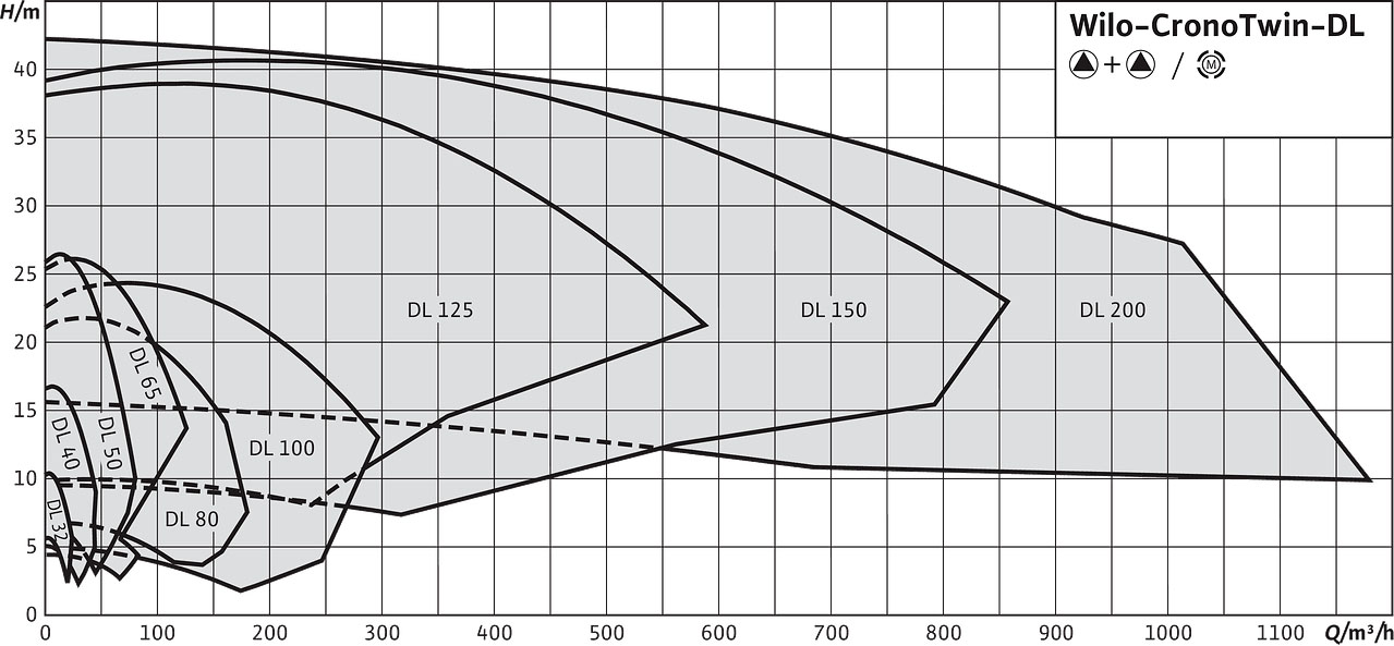 Сдвоенный линейный насос Wilo CronoTwin-DL с двумя одноступенчатыми центробежными насосами с сухим ротором в общем корпусе с перекидным клапаном для монтажа на трубопроводе или установки на фундаменте. Фланцевая заглушка корпуса и консоли предоставляются за отдельную плату. Блочная конструкция с фонарем, с низким уровнем шума и вибрации и неподвижно присоединенным унифицированным электродвигателем с фланцевым креплением (стандартный электродвигатель). С не зависящим от направления вращения скользящим торцевым уплотнением в кожухе с принудительным охлаждением и снижающим кавитацию рабочим колесом. Фланцы со штуцерами для измерения давления R 1/8.
