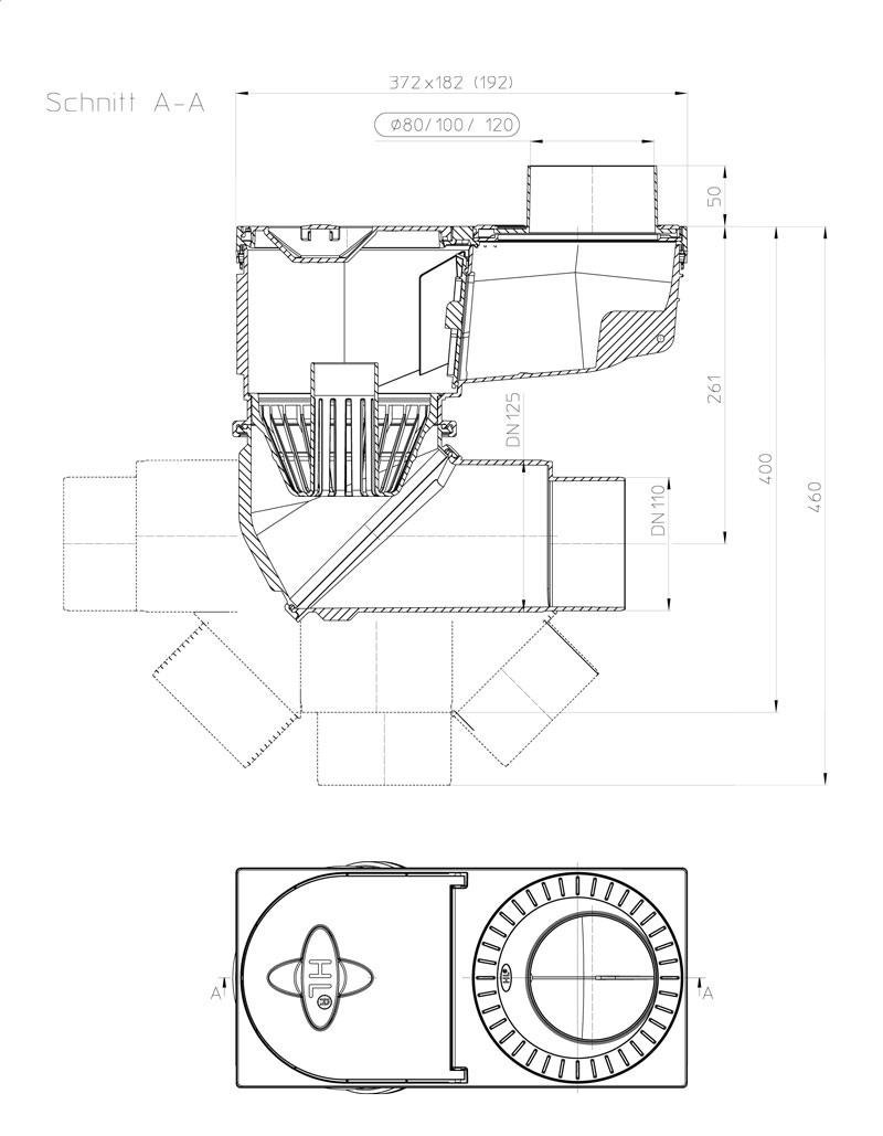 Уличный трап для приема воды из наружных ливнестоков DN110/125 с поворотным шарниром, с морозоустойчивым запахозапирающим устройством, листвоуловителем, с лючком-прочисткой, с переходником для подсоединения к водосточной трубе.