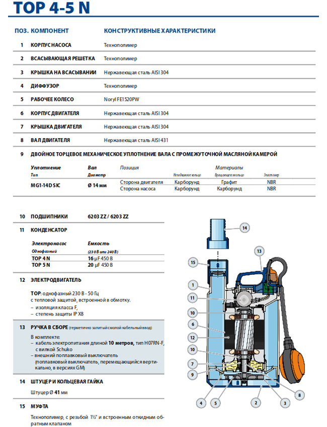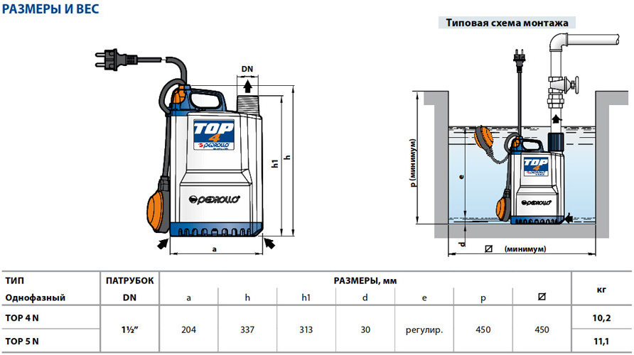 - Глубина применения ниже уровня воды: до 3 м для TOP 1-2-3; до 5 м для TOP 4-5.