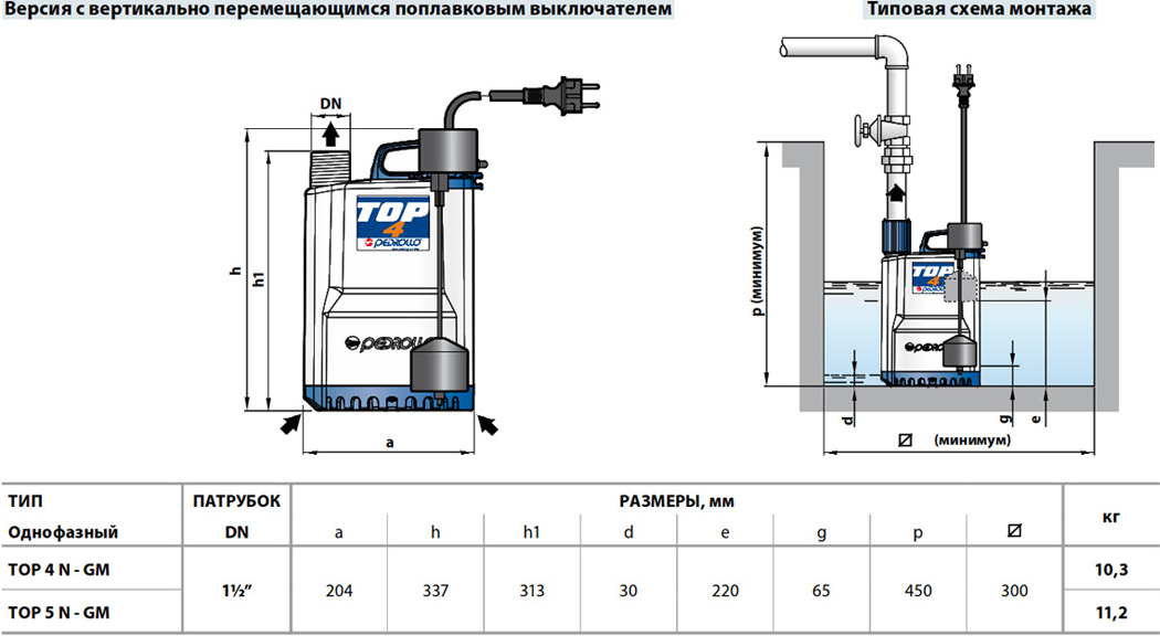 - Глубина применения ниже уровня воды: до 3 м для TOP 1-2-3; до 5 м для TOP 4-5.