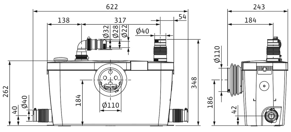 - Готовая к подключению напорная установка для отвода сточных вод с режущим механизмом, фильтром с активированным углем и встроенным обратным клапаном