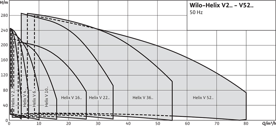 - Корпус насоса: все соприкасающиеся с перекачиваемой жидкостью элементы конструкции из нержавеющей стали 1.4409 (AISI 316L); свободные фланцы из серого чугуна EN-GJL 250 с катафорезным покрытием для Helix V 22/из чугуна с шаровидным графитом EN-GJS 400 для Helix V 36-52.