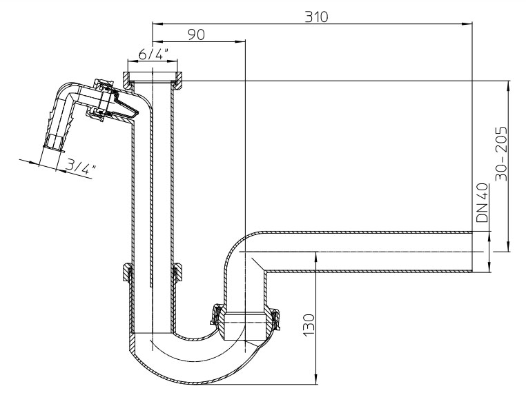 Трубный сифон с выпуском DN40, с шаровым шарниром, с регулируемой высотой патрубка, с соединительной резьбой 6/4", с возможностью подключения стиральной или посудомоечной машины 3/4".