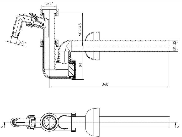Сифон для моек DN32 с регулируемой высотой патрубка с соединительной резьбой 5/4", с подключением стиральной или посудомоечной машины 3/4", с выдвижной прочисткой-грязесборником, с вращающимся выходным коленом и с декоративной розеткой. Выходное колено - поворотное.