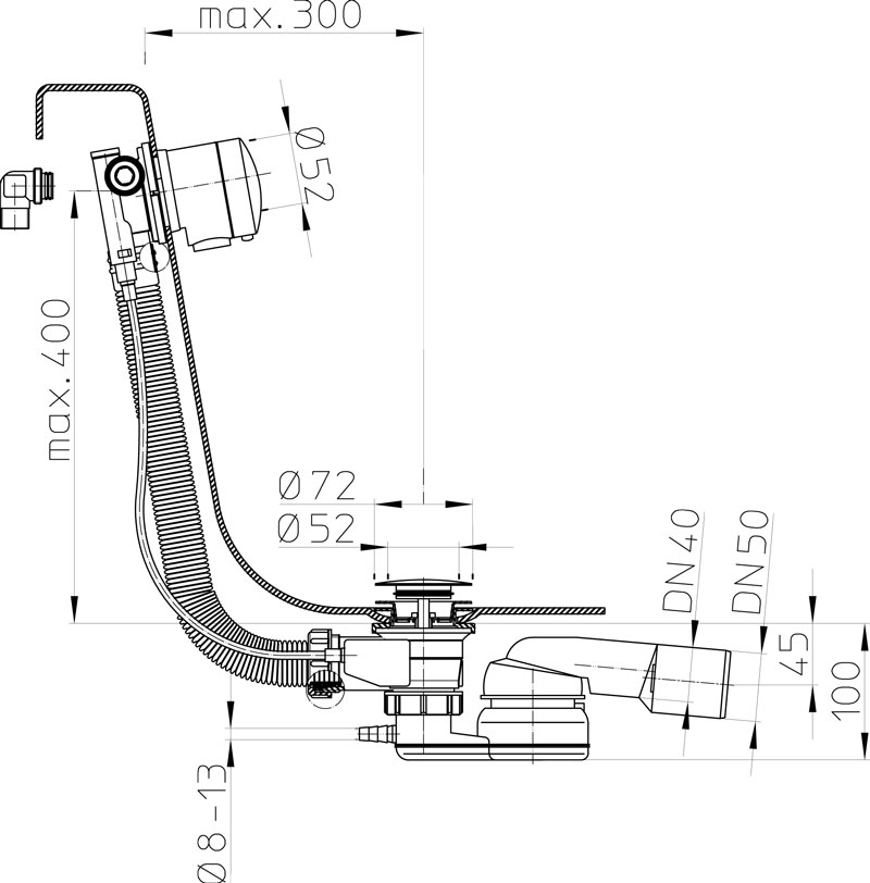 Выпуск-полуавтомат для ванн 6/4", с шарнирным сифоном DN50/40 горизонтальный выпуск (выход 280° поворота, 10° наклона) вкл. подсоединение шланга 8 - 13 мм, отверстие для подачи воды 3/4", трос Боудена 60см, видимые части - хромированны. Новая улучшенная разработка с новым механизмом зубчатой рейки для точного хода, подключение для подачи воды слева или справа, перлатор, двойная прокладка для тарелки для слива, трос Боудена из нержавеющей стали (CrNi 18/10) и прочный запирающий механизм для высокой работоспособности трапа и его долгой эксплуатации.