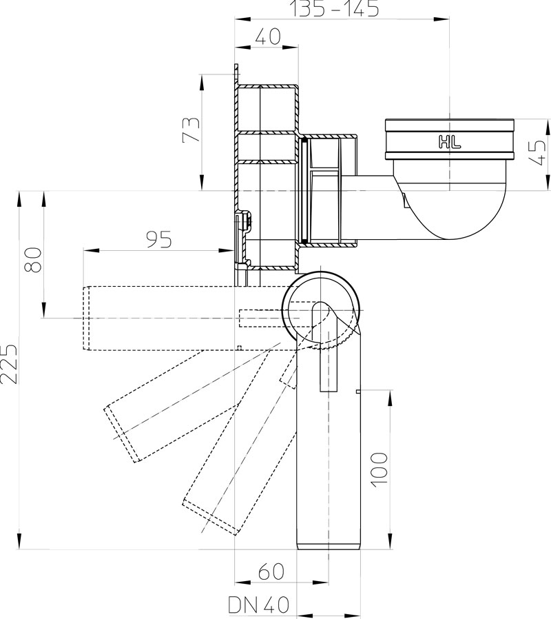 Сифон DN40 з поворотним патрубком з плавним безступінчастим налаштуванням 0 - 90°, прокладкою ущільнювача для пісуарів (DIN1390) з вертикальним випуском.