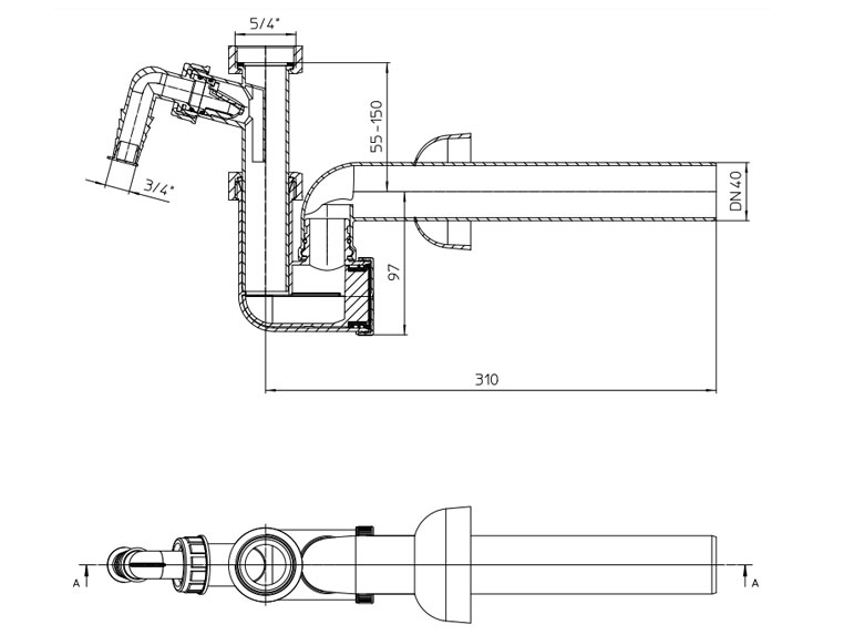 Сифон для мийок DN40 з регульованою висотою патрубка зі з'єднувальним різьбленням 5/4", з підключенням пральної або посудомийної машини 3/4", з висувним прочищенням-брусзбірником, вихідним коліном, що обертається, і з декоративною розеткою. Вихідне коліно – поворотне.