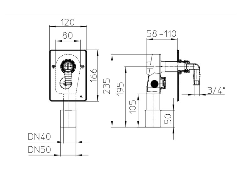 Вбудований сифон для пральної або посудомийної машини DN40/50 зі сполучним коліном 3/4" HL19, з корпусом оболонки, що знімається, з прочищенням і декоративною плитою з нержавіючої сталі. Глибина монтажу: 58мм.