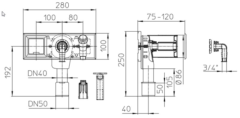 Вбудований сифон для пральної або посудомийної машини HL406E з підключенням до каналізації DN40/50, з інтегрованим підключенням води, з водопровідним краном R 1/2" та електричною розеткою.