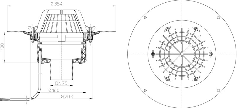 Вирва для плоских покрівель DN75 вертикальний випуск з електропідігрівом від мережі напругою 230В, потужністю 10-30Вт, з обтискним фланцем і затискним з нержавіючої сталі для прикріплення плівок ущільнювачів, з листовловлювачем d 180 мм. Будівельний захист під час монтажу у комплекті.